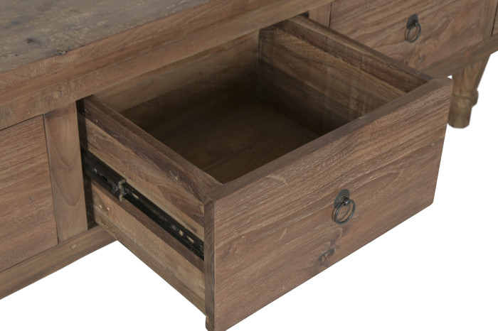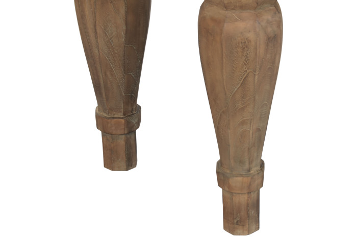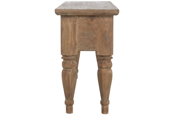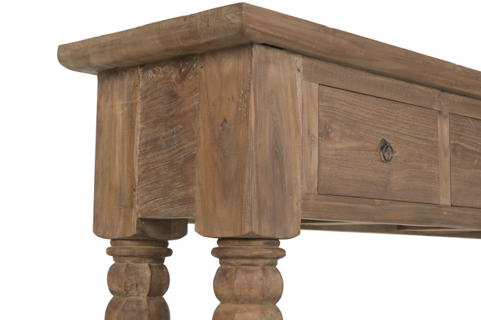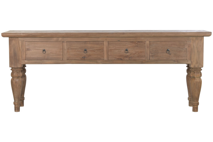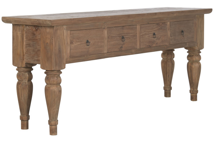 Szeroki blat pozwala na efektowną ekspozycję dekoracji, a cztery praktyczne szuflady sprawdzą się do przechowywania drobnych przedmiotów. Rzeźbione nogi w rustykalnym stylu podkreślają klasyczny urok mebla, czyniąc z niego ozdobę, która doskonale komponuje się zarówno w przestronnych salonach, jak i w korytarzach czy gabinetach. To połączenie funkcjonalności z niepowtarzalnym designem inspirowanym włoskimi rezydencjami.