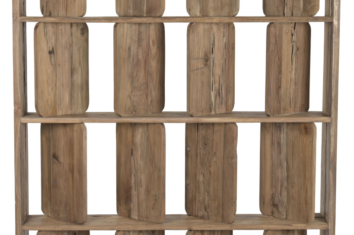Jego półki układają się w kompozycję przypominającą rytualny porządek, jakby drewno – zahartowane przez lata – samo pragnęło nadać przestrzeni spokojny, medytacyjny puls. Każda deska to fragment większej opowieści, gdzie surowość spotyka się z delikatnością, a naturalne usłojenia przypominają pejzaże malowane przez czas.