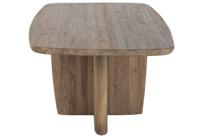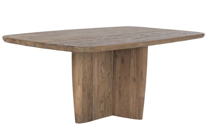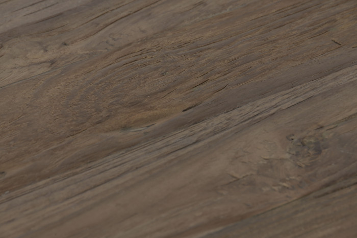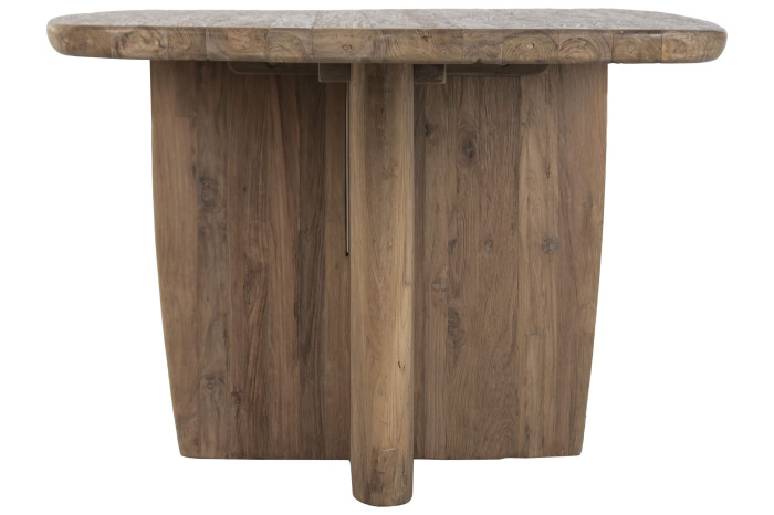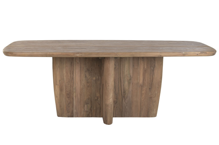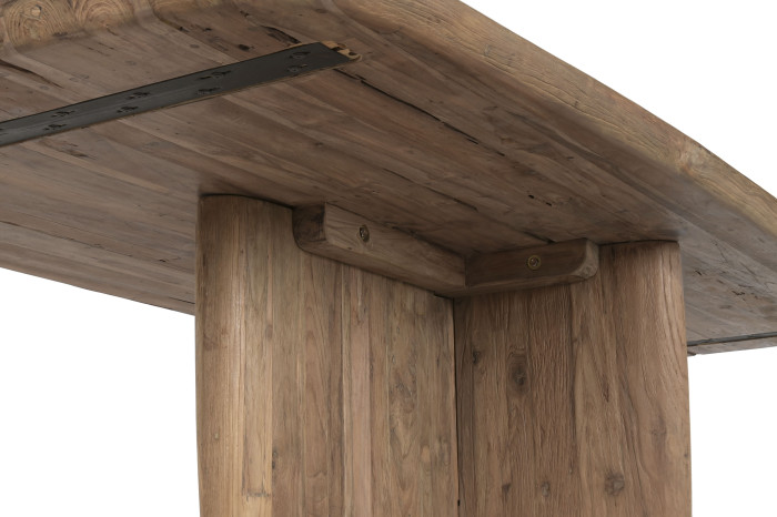 Mastywna podstawa przypomina monolit, a zarazem podkreśla organiczne piękno tekowego drewna. Blat o delikatnie zaokrąglonych krawędziach staje się sceną codziennych spotkań i wyjątkowych uroczystości. Jego powierzchnia nosi naturalne ślady historii, które nadają mu niepowtarzalny charakter i sprawiają, że każdy egzemplarz jest jedyny w swoim rodzaju.