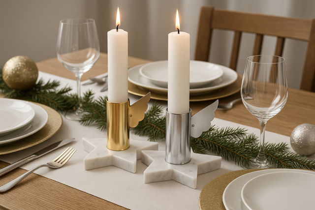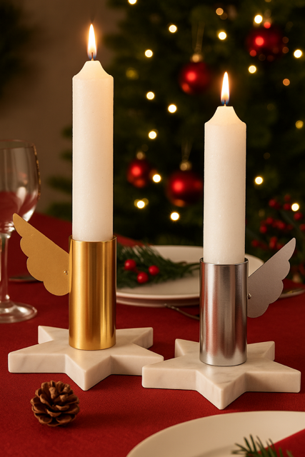 Jak dodać swojemu wnętrzu odrobiny magii, która sprawdzi się zarówno na co dzień, jak i podczas świątecznych chwil spędzanych przy stole? Świecznik Anielskie Skrzydło w kolorze złotym lub srebrnym to dekoracja, która subtelnie łączy elegancję z symboliką anielskiej ochrony. Jego wyjątkowa forma w kształcie marmurowej gwiazdy sprawia, że każda świeca zyskuje niepowtarzalny charakter.
