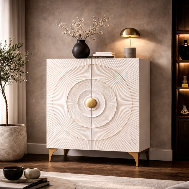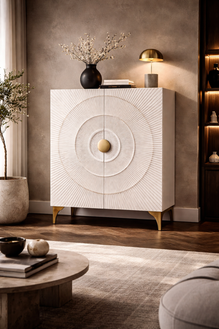 Jak często zdarza się mebel, który już od progu roztacza aurę luksusu niczym promienie zachodzącego słońca? Komoda szafa Golden Sunset drewniana mango biała zachwyca wyrafinowaną formą, która łączy sztukę rzeźby z nowoczesnym designem. Delikatne żłobienia na frontach, tworzące efekt koncentrycznych fal, przywodzą na myśl złoty blask słońca o zmierzchu, subtelnie odbijający się na matowej bieli.