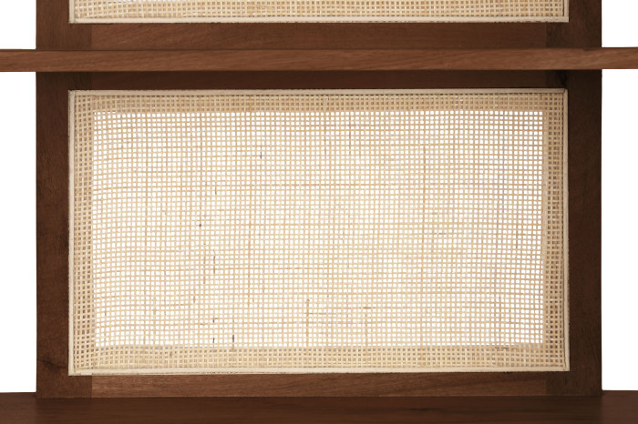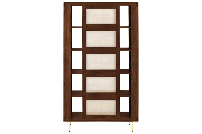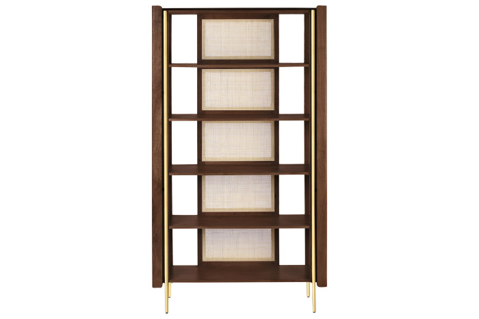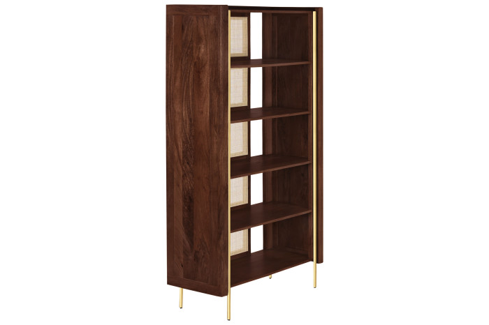 Regał Capri to mebel, który nie pełni roli tła – on sam jest sceną. Ciemne drewno mango w połączeniu z jasnymi panelami z rattanu oraz subtelnymi, złotymi detalami tworzy niezwykłą kompozycję, przypominającą dzieło sztuki użytkowej. Każda półka to przestrzeń, w której można eksponować książki, ceramikę lub sztukę, nadając wnętrzu charakter galerii, a nie zwykłego salonu.
