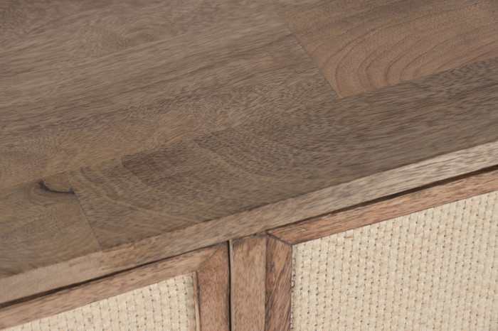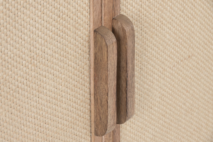Trzy pojemne szafki z jutowymi frontami oferują nie tylko funkcjonalność, ale także wyjątkowy efekt wizualny. To mebel, który doskonale wpisuje się w trend natural living – łącząc prostotę, ciepło i organiczne materiały. Bahia jute wnosi do aranżacji przyjemne poczucie bliskości natury, a jej ponadczasowa forma sprawia, że świetnie komponuje się z różnorodnymi dodatkami – od ceramiki po rośliny w donicach.
