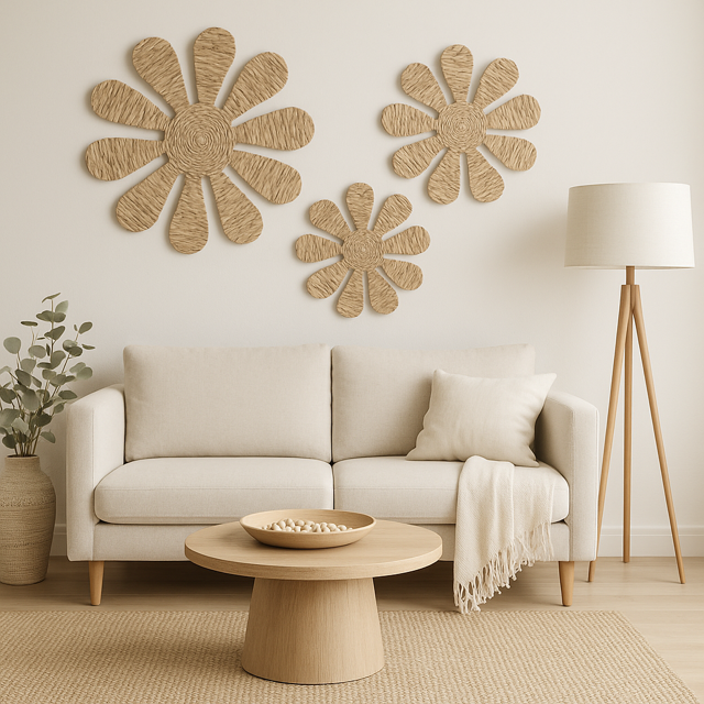 Każda dekoracja ma kształt kwiatowego rozkwitu – ręcznie plecione płatki tworzą efekt przestrzenności, który pięknie prezentuje się na jednolitej ścianie. Zestaw zawiera trzy elementy o różnych średnicach (60, 50 i 40 cm), dzięki czemu można tworzyć kompozycje dopasowane do indywidualnej aranżacji. To wyjątkowa ozdoba do salonu, sypialni, przedpokoju czy jadalni, idealna do wnętrz w stylu boho, natural, skandynawskim oraz mediterranean.