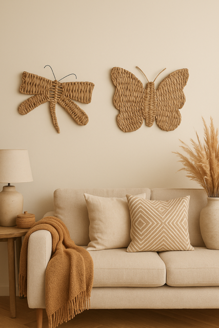 Każdy element zestawu – motyl i ważka – został zaprojektowany z dbałością o formę i fakturę, tworząc przyjemny dla oka efekt organicznego splotu. Naturalny odcień hiacyntu wodnego wprowadza przytulną atmosferę, a ręcznie wykonane plecionki nadają wnętrzu lekko rustykalny, ale jednocześnie nowoczesny charakter.