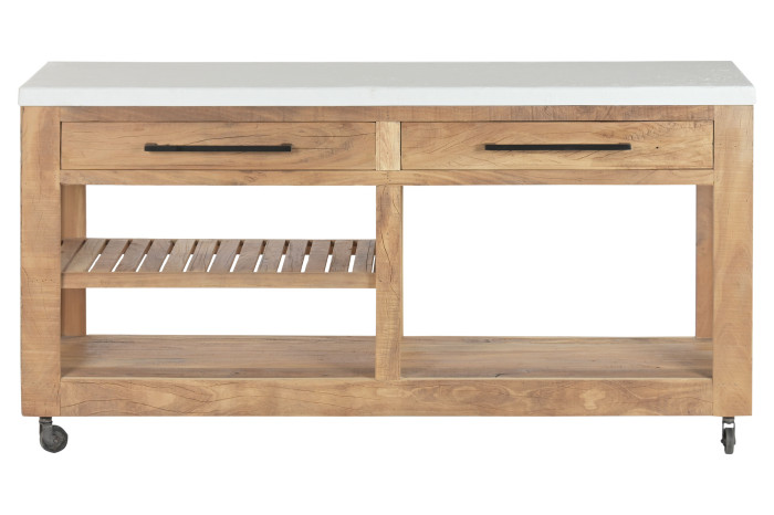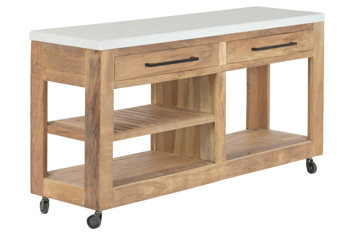 Komoda wykonana z litego drewna mango z recyklingu zachowuje oryginalne usłojenie i strukturę, nadając meblowi autentyczny, naturalny charakter. Delikatnie zaoblone krawędzie i gładkie linie nawiązują do kształtów greckich fasad, które miękko wtapiają się w krajobraz. Jasny blat w tonacji bieli kontrastuje z ciepłem drewna, tworząc kompozycję pełną równowagi. Dwie szuflady, praktyczne otwarte półki oraz solidne kółka sprawiają, że komoda jest zarówno funkcjonalna, jak i stylowa.