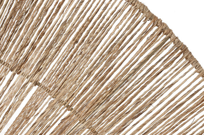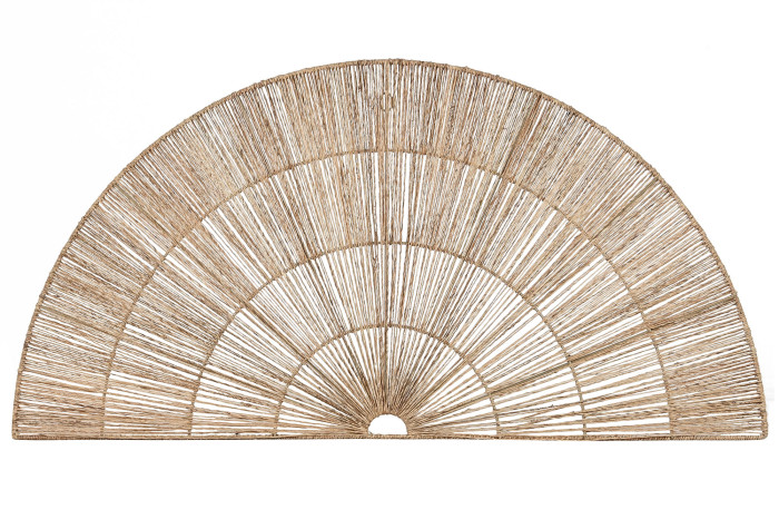Dekoracja została wykonana z juty i metalu, co pozwoliło uzyskać zjawiskowy efekt przestrzenny. Promienisty układ sznurków tworzy delikatny wzór przypominający wachlarz lub wschodzące słońce. Taka kompozycja pięknie prezentuje się nad łóżkiem w sypialni, nad sofą lub komodą, dodając wnętrzu lekkości i naturalnej elegancji.