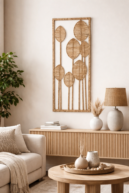 Dekoracja ścienna Boho 80 cm doskonale komponuje się z wnętrzami boho, scandi, modern natural i japandi. Pasuje do jasnych ścian, drewna, wikliny i tkanin w beżach czy piaskowych odcieniach. Jej minimalistyczna forma nadaje przestrzeni wrażenie spokoju i ładu, wnosząc subtelną elegancję inspirowaną przyrodą.