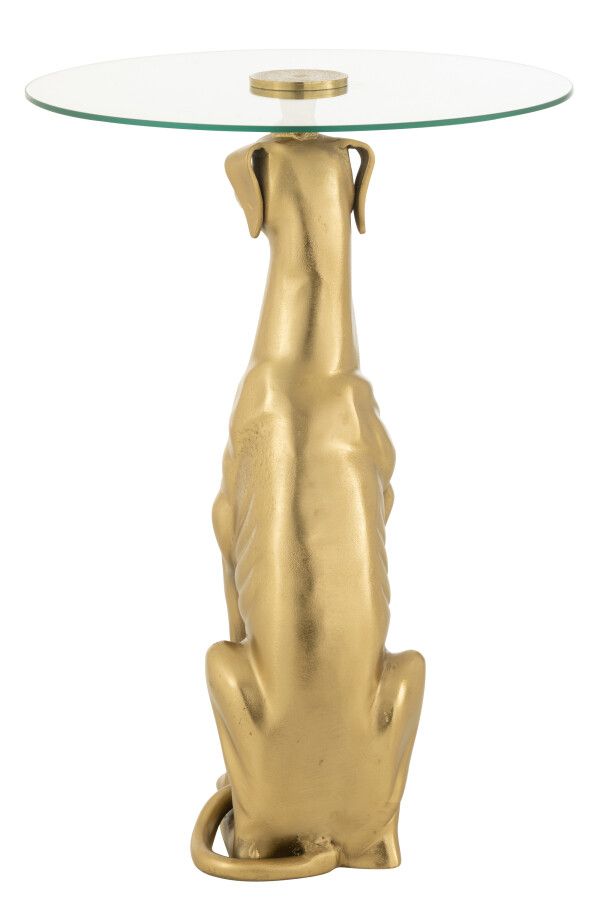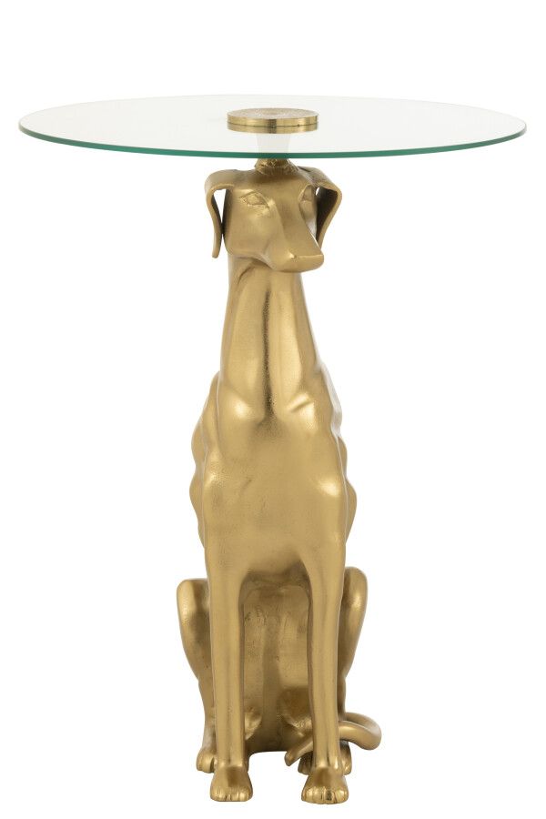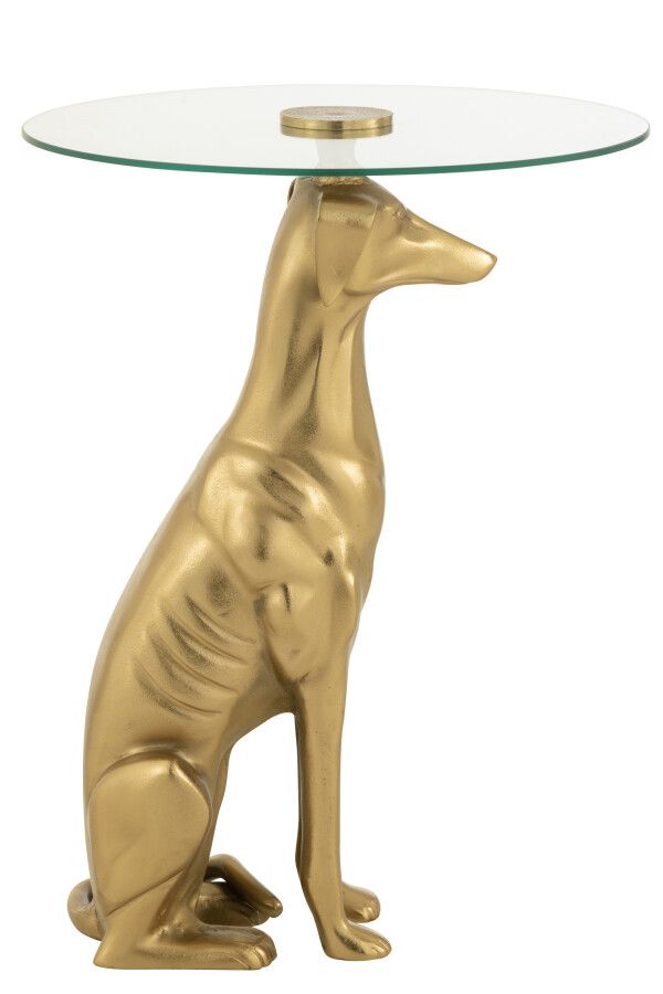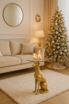 Czy wyobrażasz sobie spotkanie elegancji z artystyczną fantazją? Ten stolik w kształcie dumnego charta zamienionego w podstawę to prawdziwa ozdoba salonu — błyszczący, nietuzinkowy i pełen klasy. Jego okrągły, szklany blat delikatnie kontrastuje ze złotą sylwetką psa, tworząc efektowny detal, który doskonale podkreśli wyjątkowy charakter wnętrza.