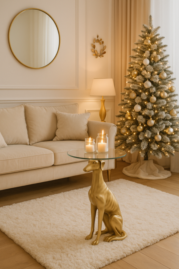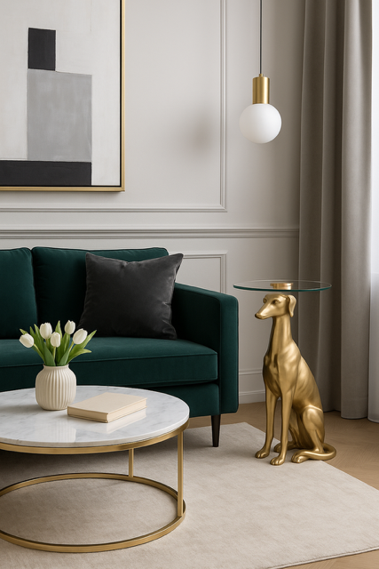 Złoty Greyhound świetnie odnajdzie się w aranżacjach glamour, nowoczesnych, eklektycznych i art déco, gdzie królują lustrzane powierzchnie, złote akcenty i designerskie dodatki. Umieszczony przy aksamitnej sofie, kominku lub w rogu salonu z subtelnym oświetleniem, stanie się elementem, który doda przestrzeni blasku i elegancji.
