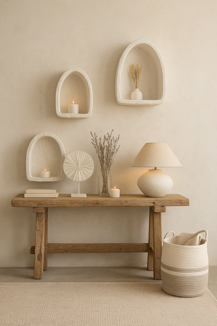 Regały Santorini znakomicie odnajdą się w aranżacjach boho, skandynawskich czy śródziemnomorskich, gdzie króluje jasna kolorystyka i naturalne faktury. Świetnie wyglądają w salonie, sypialni lub korytarzu – zarówno jako dekoracja ścienna, jak i subtelne tło dla małych przedmiotów.