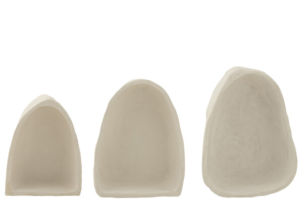 Każdy z trzech regałów wykonano z papier-mâché, co nadaje im niepowtarzalną teksturę i rękodzielniczy urok. Zestaw możesz zawiesić na ścianie lub ustawić na konsoli, tworząc oryginalną ekspozycję, która zachwyci prostotą i elegancją. Ich asymetryczne kształty doskonale współgrają z naturalnymi materiałami – drewnem, lnem czy wikliną – tworząc spójną, spokojną kompozycję.