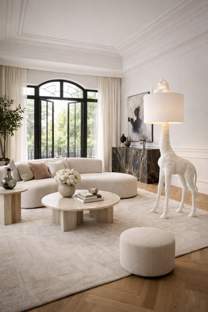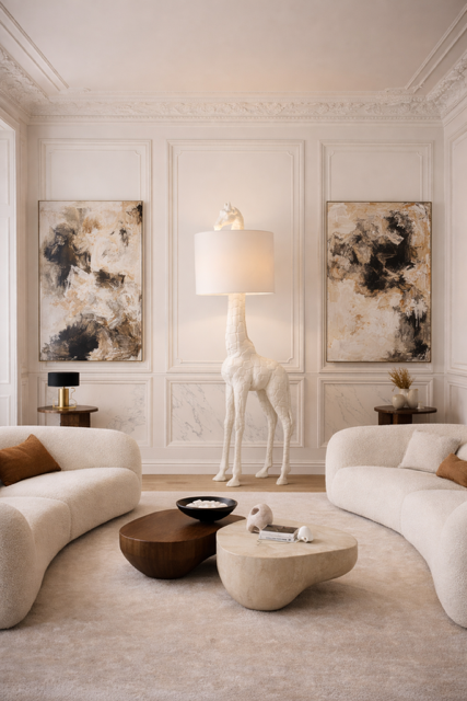 Lampa podłogowa Żyrafa doskonale odnajdzie się w przestronnych salonach, loftach, wnętrzach w stylu modern, art deco lub eklektycznym. Świetnie prezentuje się przy sofie, w rogu pokoju lub obok fotela do czytania, gdzie pełni nie tylko funkcję oświetlenia, ale też elementu dekoracyjnego. W zestawieniu z jasnymi kolorami, naturalnymi materiałami i metalicznymi akcentami tworzy nowoczesną, wyrafinowaną całość.
