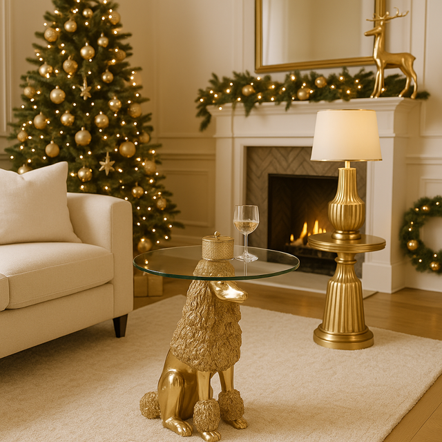 Jak połączyć funkcjonalność z niepowtarzalnym designem, który natychmiast staje się tematem rozmów? Złoty stolik kawowy Pudel to mebel, który zachwyca formą i artystycznym charakterem. Złoty pies w roli podstawy pod szklanym blatem prezentuje się z elegancją i humorem, tworząc przedmiot z pogranicza sztuki i użytkowego designu.
