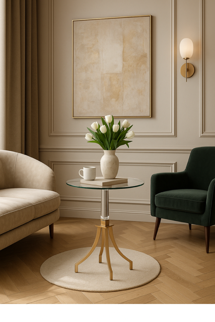 Wnętrze, w którym staje Gold Shine, staje się sceną dla światła. Delikatny transparentny blat unosi się lekko nad przestrzenią, łapiąc każdy refleks dnia jak spokojna tafla jeziora. Złote linie podstawy lśnią subtelnie — nie dominują, lecz współgrają. To stolik, który nie potrzebuje uwagi, by ją przyciągać. Jego obecność wycisza i równocześnie dodaje wnętrzu życia.