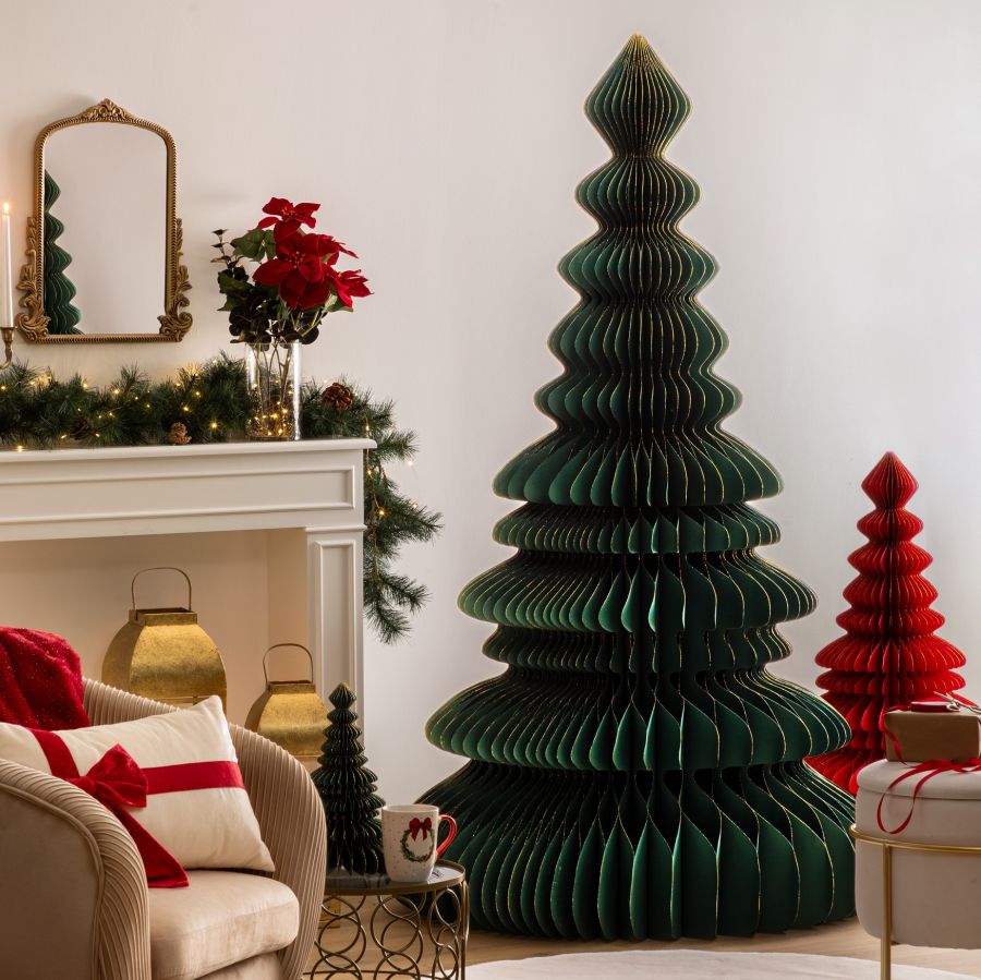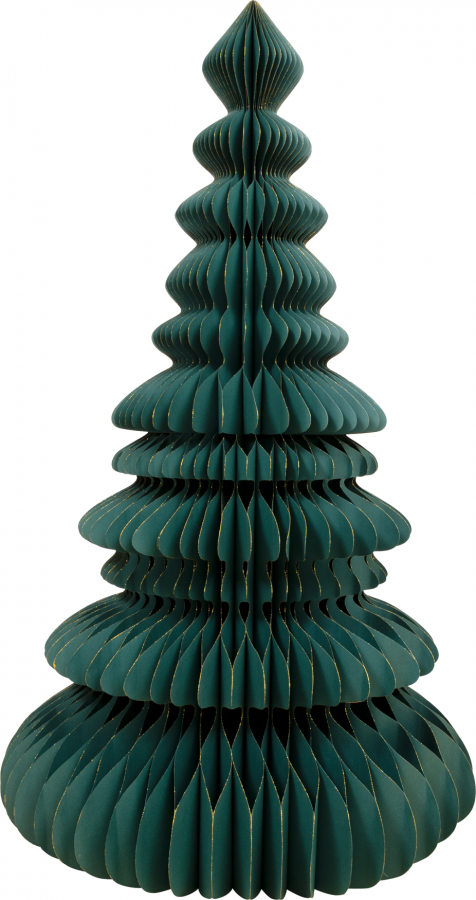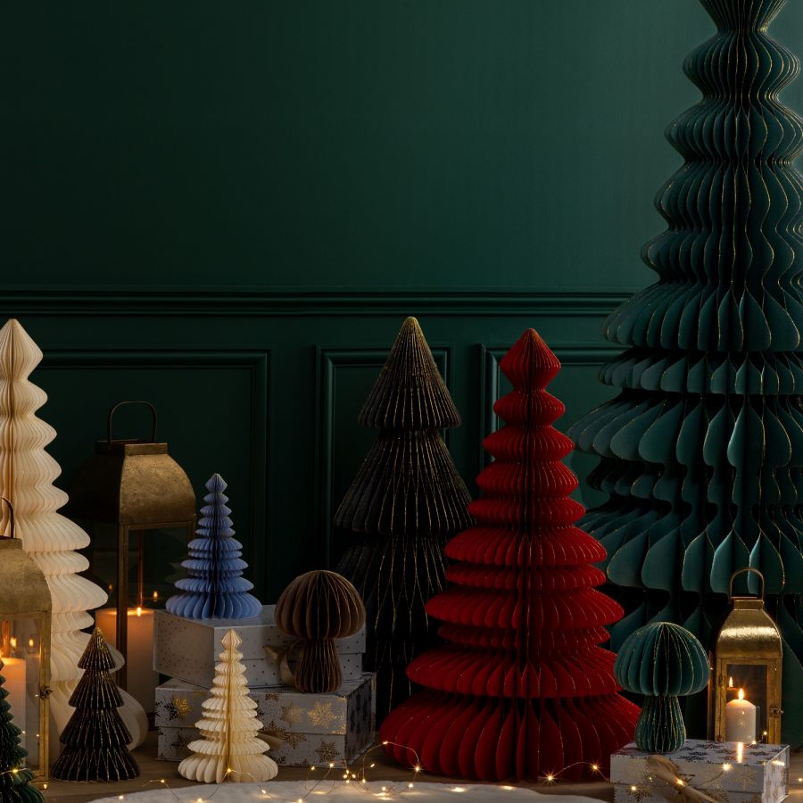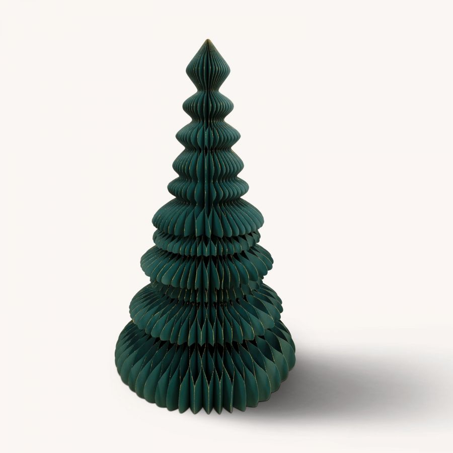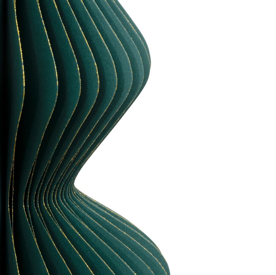 Wykonana z grubego, przestrzennego papieru o strukturze plastra miodu, choinka po rozłożeniu prezentuje się okazale i trójwymiarowo. Delikatne złote wykończenia na krawędziach dodają jej szlachetności, a składana konstrukcja pozwala z łatwością przechować ją po sezonie. To wyjątkowa ozdoba, która łączy w sobie design, lekkość i nowoczesną elegancję.
