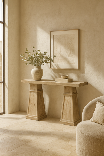 Idealna do przedpokoju, salonu lub jadalni – Tivoli doskonale prezentuje się w aranżacjach w stylu rustykalnym, prowansalskim, klasycznym, a także modern farmhouse. Można na niej ustawić wazon z gałązkami eukaliptusa, duże lustro w drewnianej ramie lub lampion z ciepłym światłem, tworząc spójną i elegancką kompozycję. Jej naturalny kolor pięknie współgra z beżami, szarościami i złamanymi bielami, wprowadzając do wnętrza przyjemną, wyważoną estetykę.