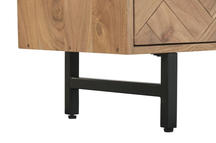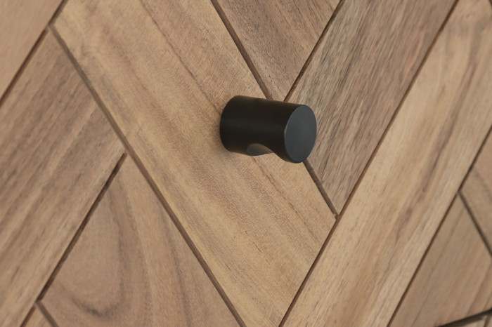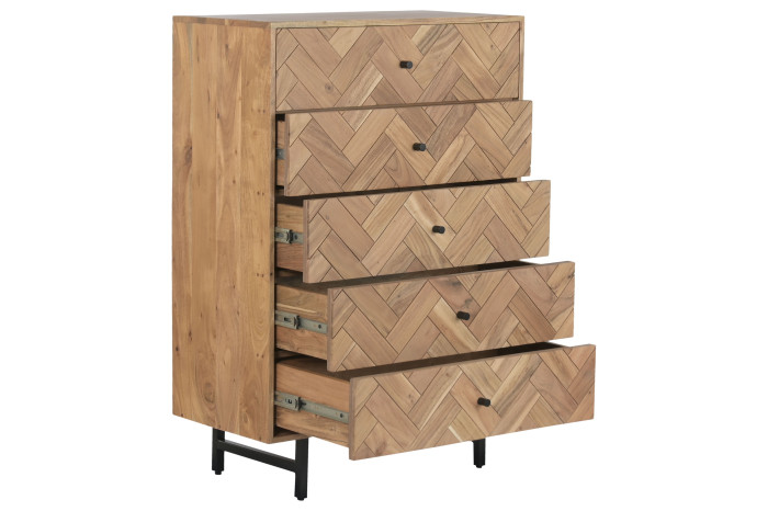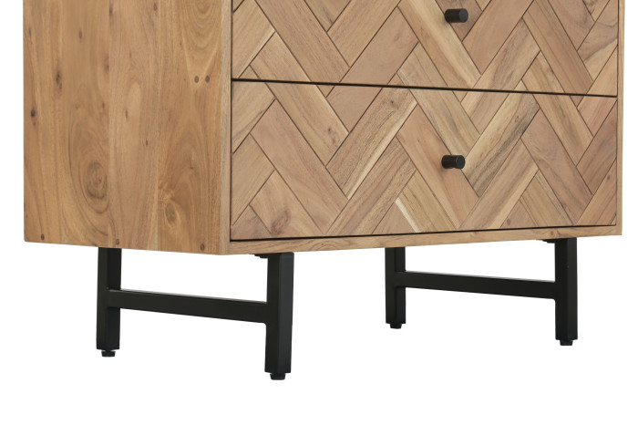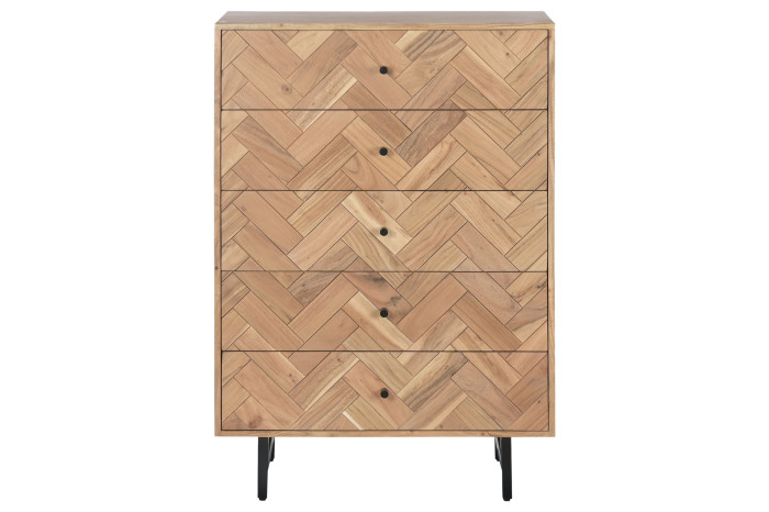 Jak zamknąć naturalne piękno w formie pełnej harmonii i porządku? Komoda Chevron z pięcioma szufladami to mebel, który czyni to z niezwykłą gracją. Każdy front ozdobiony wzorem jodełki ukazuje rytm usłojenia, tworząc efekt mozaiki inspirowanej klasycznym parkietem. Ciepły kolor drewna akacjowego przełamany został subtelnym akcentem czarnego metalu, dzięki czemu całość emanuje elegancją i lekkością.