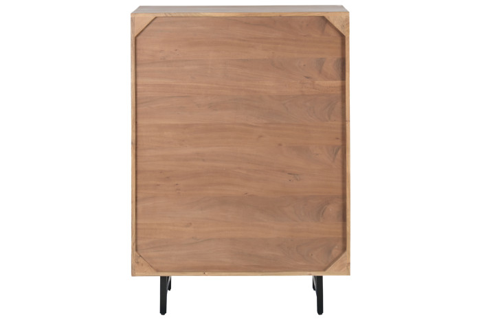 Pięć głębokich szuflad pozwala uporządkować przestrzeń – idealnie sprawdzą się w sypialni, salonie lub garderobie, gdzie estetyka i funkcjonalność muszą iść w parze. Smukłe, czarne nogi unoszą całą bryłę, nadając jej lekkości i nowoczesnego charakteru, a jednocześnie podkreślają kontrast pomiędzy naturalnym drewnem a industrialną nutą.