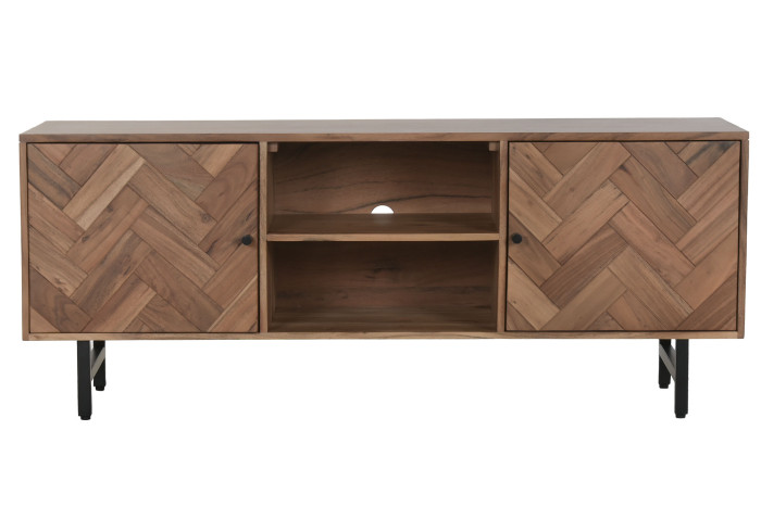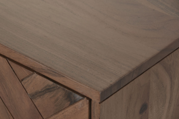Czy może istnieć mebel, który łączy w sobie naturalne ciepło z geometryczną precyzją? Komoda RTV Chevron zachwyca wzorem frontów w charakterystyczną jodełkę, tworząc niezwykły dialog między naturą a współczesnym designem. Ciepły odcień drewna akacjowego nadaje wnętrzu przytulności, a delikatny połysk metalowych detali podkreśla jej wyrafinowany charakter.