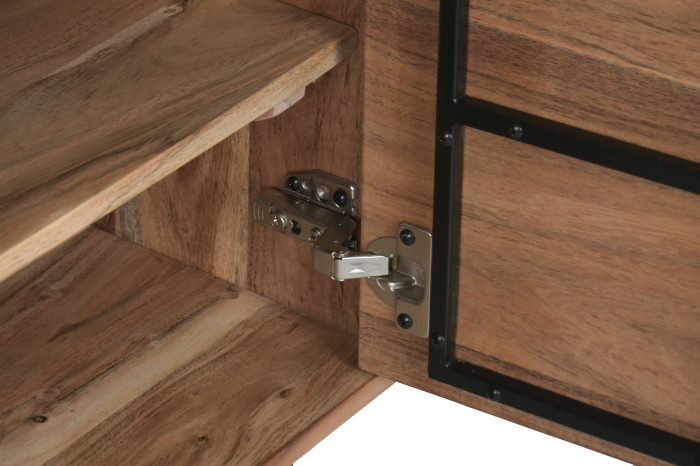 Za drzwiami po obu stronach ukryto przestronne schowki, które pomieszczą sprzęt elektroniczny lub akcesoria multimedialne, a otwarte półki w centrum doskonale eksponują książki, płyty lub dekoracje. Mebel zachowuje przy tym lekkość formy – smukłe, czarne nogi unoszą konstrukcję, dodając całości elegancji i nowoczesności.