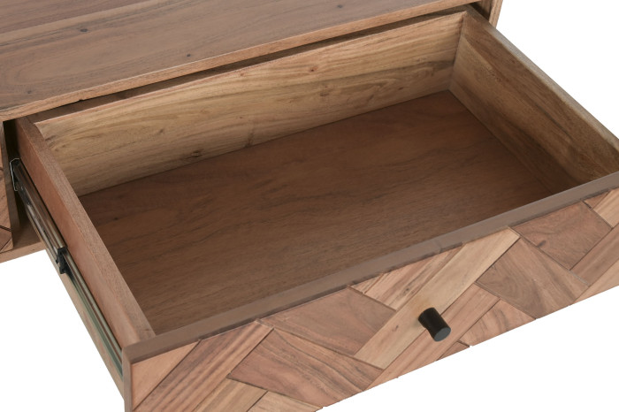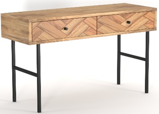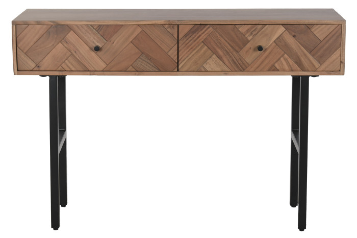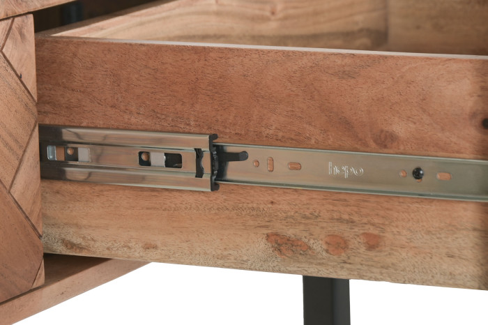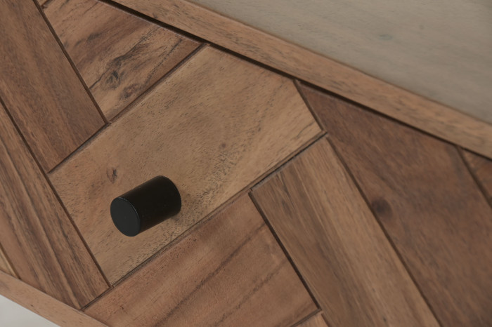 Czy można połączyć naturalne piękno drewna z nowoczesną geometrią? Konsola Chevron zachwyca wzorem frontów ułożonych w charakterystyczną jodełkę, która nadaje meblowi artystycznego wyrazu. Ciepły odcień akacji kontrastuje z czarnymi, metalowymi nogami, tworząc harmonijną kompozycję łączącą naturę i współczesny design.