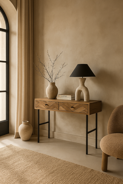 Ta konsola to mebel, który doskonale dopełni aranżacje w stylu industrialnym, nowoczesnym, scandi czy japandi. Zestaw ją z naturalnymi tkaninami, roślinami i miękkim oświetleniem, a przestrzeń zyska wyważony, designerski charakter.