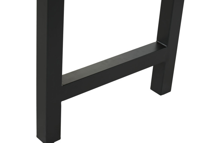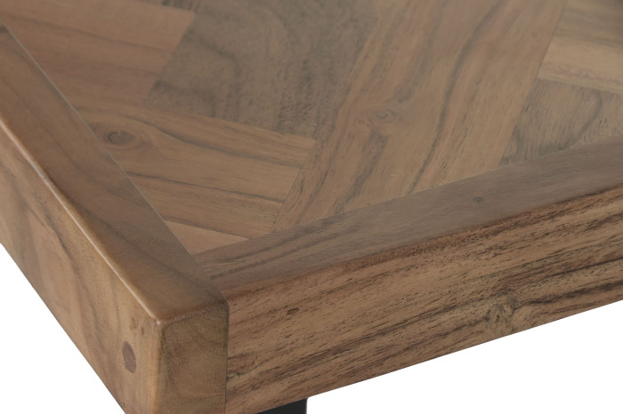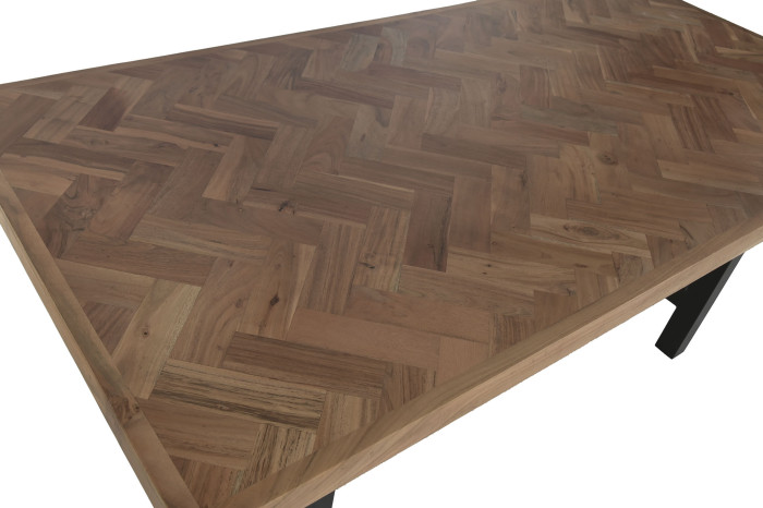 Blat w charakterystyczny wzór chevron zachwyca naturalnymi odcieniami akacji – od miodowego po lekko karmelowy. Drewno emanuje autentycznością, której nie da się podrobić, a jego struktura przyciąga światło i tworzy w pomieszczeniu atmosferę pełną spokoju. Czarna metalowa podstawa nadaje stołowi nowoczesnej lekkości i stabilności, tworząc niezwykle stylowy kontrast.
