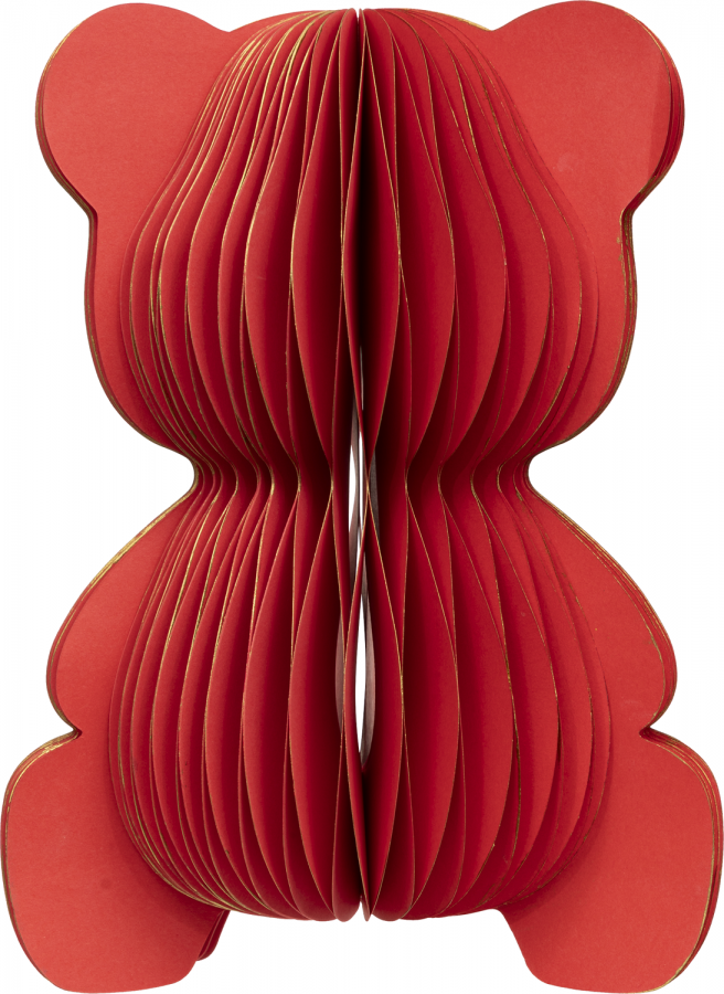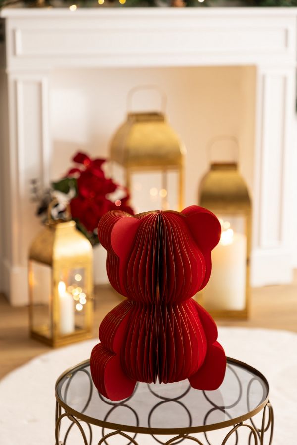 Każde zagięcie papieru zostało zaprojektowane tak, by nadać misiowi miękki, przestrzenny kształt, który wygląda niemal jak bajkowa figurka. Wysokość 30 cm sprawia, że idealnie prezentuje się na półce, parapecie lub świątecznym stole, obok świec i gałązek świerku. Czerwony kolor symbolizuje ciepło, miłość i radość, tworząc wyjątkowy akcent w każdej aranżacji.