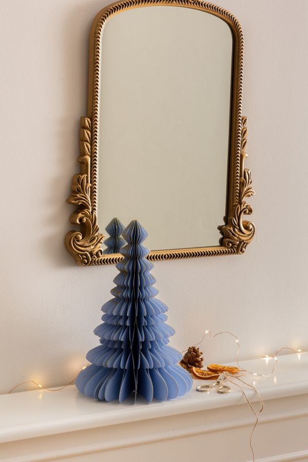 Choinka wykonana jest z grubego, przestrzennego papieru o strukturze origami, który po rozłożeniu tworzy efektowną, trójwymiarową formę. Złote wykończenia na krawędziach dodają jej blasku i sprawiają, że pięknie prezentuje się w świetle lampek choinkowych. Choinka origami Blue doskonale wygląda na komodzie, biurku, parapecie czy stole – wszędzie tam, gdzie liczy się detal i styl.