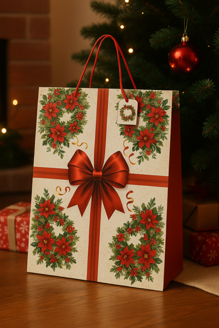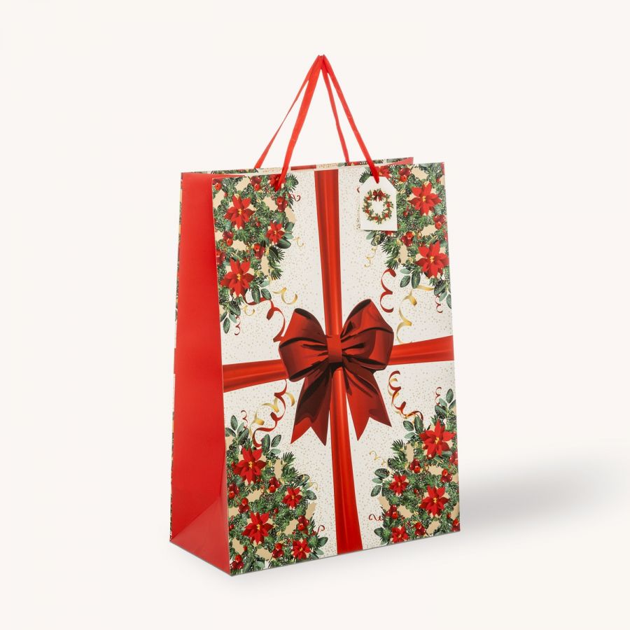 Czy jest coś piękniejszego niż moment wręczania prezentu w opakowaniu, które samo w sobie wygląda jak świąteczne arcydzieło? Papierowa torebka prezentowa Present otula upominki w aurę radości i elegancji, przywodząc na myśl najpiękniejsze chwile Bożego Narodzenia. Zdobiona motywem czerwonej kokardy i świątecznych wianków, wypełnia wnętrze ciepłem i blaskiem zimowych dni.