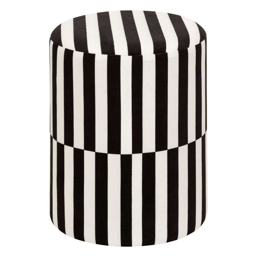 Wysokość 38 cm sprawia, że pufa idealnie sprawdza się jako dodatkowe siedzisko, podnóżek lub stolik pomocniczy. Jej formę wyróżnia gra kontrastów – czarno-białe pasy wprowadzają do wnętrza rytm i porządek, jednocześnie dodając mu odrobiny artystycznej nonszalancji. To propozycja dla tych, którzy kochają odważne detale i subtelną ekstrawagancję w nowoczesnym wydaniu.