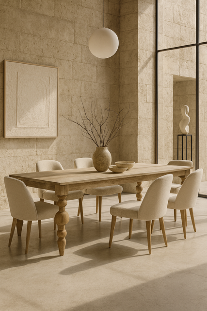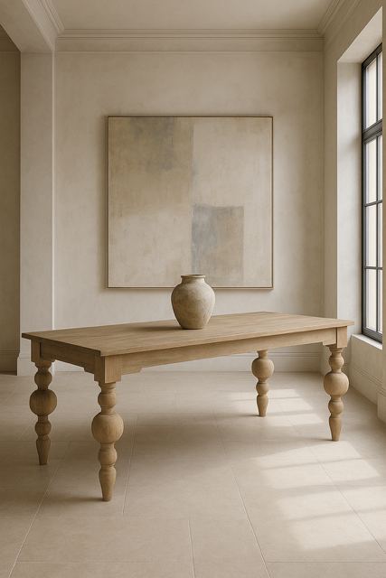 Valbonne doskonale odnajduje się w dużych, jasnych salonach, przestronnych jadalniach w stylu francuskim, paryskim modern chic czy rustykalnym premium. Wspaniale komponuje się z tapicerowanymi krzesłami w jasnych tonacjach, lnianymi zasłonami i delikatnym światłem wpadającym przez duże przeszklenia. To stół, który staje się sercem domu – miejscem spotkań, rozmów i celebracji piękna codzienności.