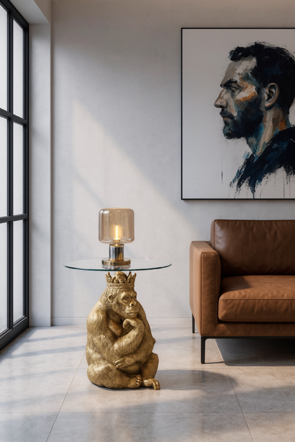 Jest w nim coś, co od razu przyciąga uwagę – pewność siebie, duma i artystyczna moc formy. Stolik złoty Gorilla King to odważny akcent we wnętrzu, który łączy w sobie funkcję i rzeźbiarski charakter. Szklany blat oparty na figurze goryla w koronie tworzy niepowtarzalny mebel, będący jednocześnie elementem użytkowym i dekoracyjnym.