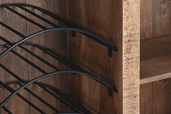 To komoda zaprojektowana z myślą o osobach, które rozumieją znaczenie detalu. Symetryczny układ otwartych półek i centralny stojak na wino nie są tu przypadkiem — każdy element został przemyślany, aby podkreślić rytm i porządek w aranżacji wnętrza. Metalowe akcenty nadają lekkości, a całość tworzy kompozycję, która przyciąga uwagę subtelną elegancją.