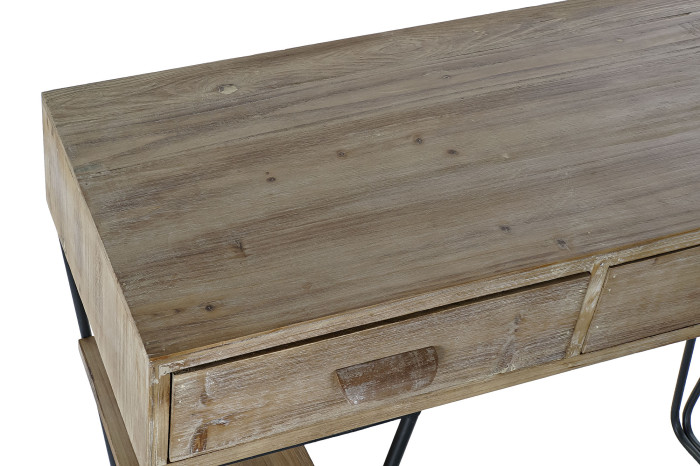 Cienkie, czarne nogi o niebanalnym kształcie nadają meblowi wizualnej lekkości, a drewniany blat z widocznym rysunkiem słojów wprowadza do wnętrza naturalny rytm. Trzy pojemne szuflady i dwie dodatkowe półki po bokach czynią z tej konsoli mebel, który oprócz stylu oferuje również funkcjonalność.