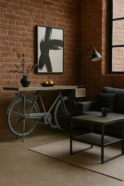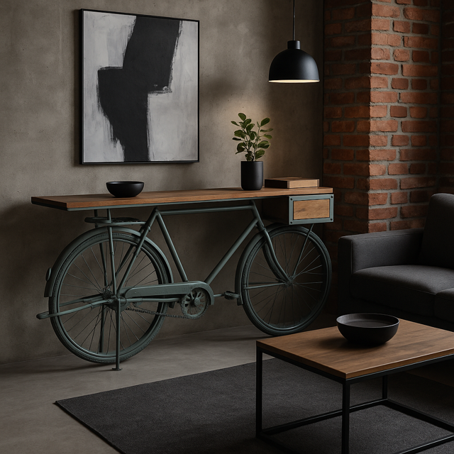 To mebel dla osób, które poszukują bardzo nietuzinkowego elementu wnętrza. Jeśli fascynuje Cię industrialny styl, masz słabość do designerskich detali lub jesteś pasjonatem rowerów, ta konsola-regał będzie idealnym wyborem. Świetnie sprawdzi się jako stół pomocniczy, barek lub efektowna dekoracja w salonie czy holu — funkcjonalna, praktyczna i z charakterem.