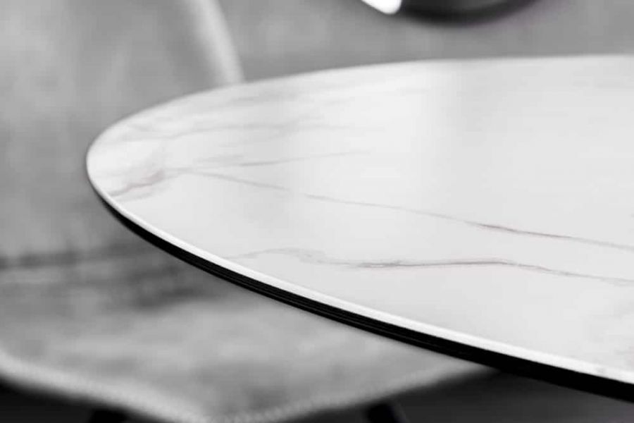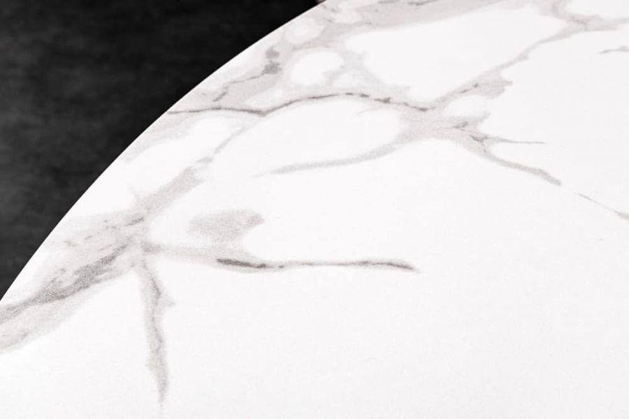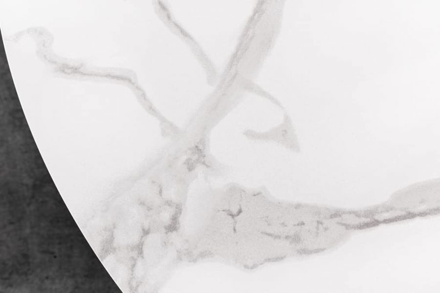 Okrągły stół ceramiczny Alpine 120 cm marmur biały zachwyca połączeniem subtelnego blatu i rzeźbiarskiej podstawy. Ceramiczna płyta o średnicy 120 cm prezentuje jasny marmurowy motyw, który nadaje powierzchni lekkości i wyciszonej elegancji. Podstawa w czerni, zbudowana z krzyżujących się elementów, wprowadza do kompozycji dynamikę i współczesny rytm, tworząc równowagę pomiędzy delikatnością blatu a wyrazistością formy.