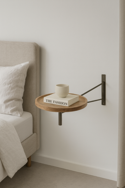 Okrągły blat wykonany z naturalnego drewna wizualnie ociepla ścianę, a metalowy, lekki w odbiorze wspornik umożliwia płynne obracanie półki. Dzięki temu element staje się dynamiczną częścią aranżacji — raz stolikiem nocnym, innym razem miejscem na dekoracje, a kiedy indziej dyskretną półką przy fotelu czy w korytarzu.