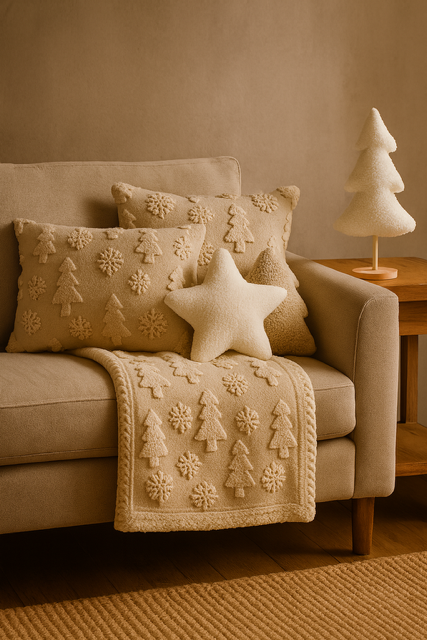 Wypukłe wzory choinek i śnieżnych płatków tworzą ciekawą, trójwymiarową grę faktur. Ta dekoracja pięknie prezentuje się na sofie, fotelu, ławce w przedpokoju czy na łóżku, dodając całości spokojnego, zimowego wdzięku. Jej miękkość zachęca, by po nią sięgnąć, a beżowa tonacja harmonizuje z jasnymi, naturalnymi dodatkami.