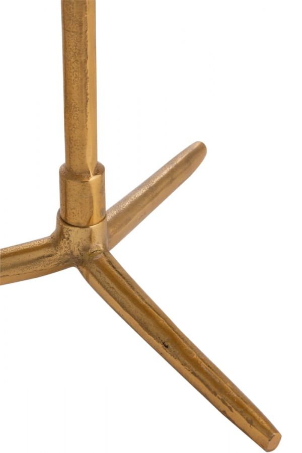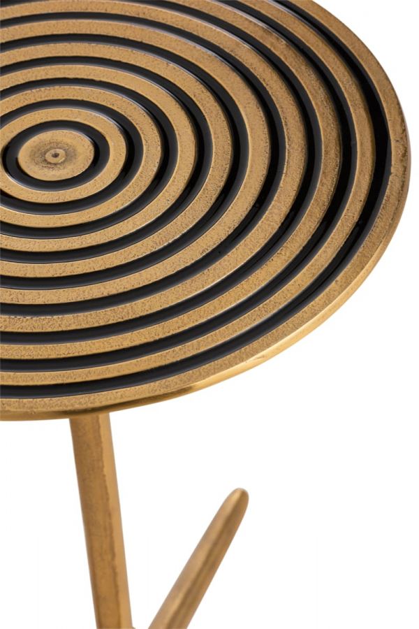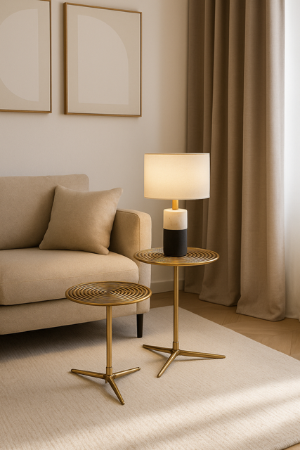 Smukłe podstawy zakończone minimalistycznymi ramionami nadają im lekkości, podczas gdy złote wykończenie wprowadza subtelny luksus. Spirale na blatach tworzą efekt głębi, dzięki czemu stoliki prezentują się jak małe instalacje artystyczne. Idealnie sprawdzą się jako miejsce na lampę, dekorację, filiżankę, a jednocześnie jako designerski akcent, który podkreśla charakter całego wnętrza.