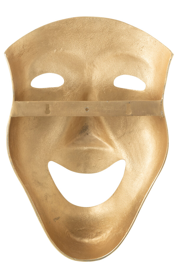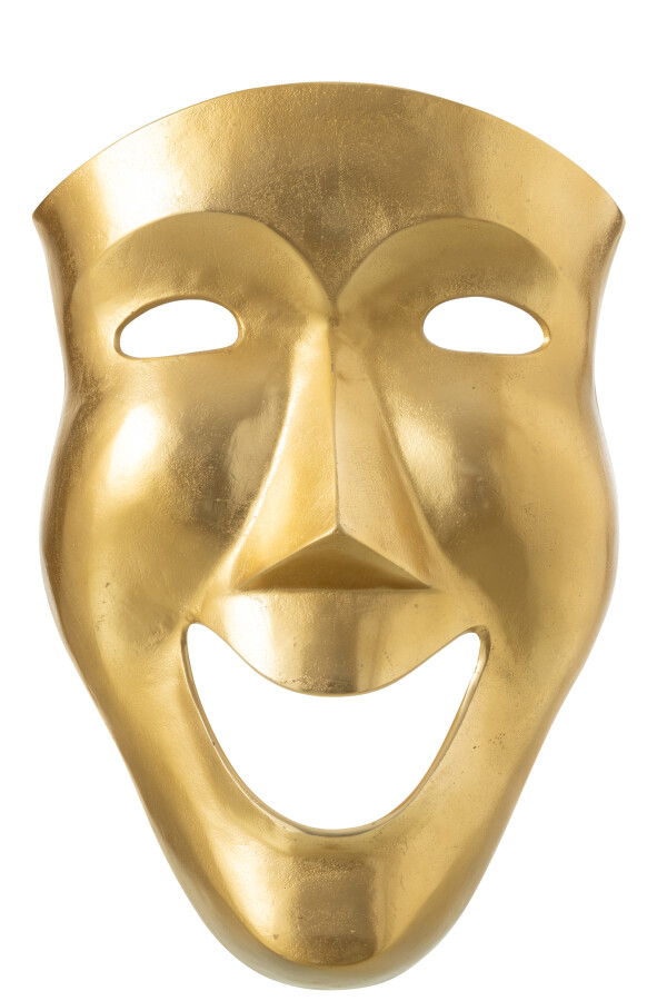 Połyskujące złoto subtelnie odbija światło, dzięki czemu maska pięknie prezentuje się zarówno w świetle naturalnym, jak i wieczornym – w pobliżu lamp o ciepłej barwie nabiera wyjątkowej głębi. Gładkie linie i płynne przejścia kształtów sprawiają, że dekoracja jest jednocześnie nowoczesna i pełna klasy, mocno wyróżniając się na tle spokojnych, stonowanych ścian.