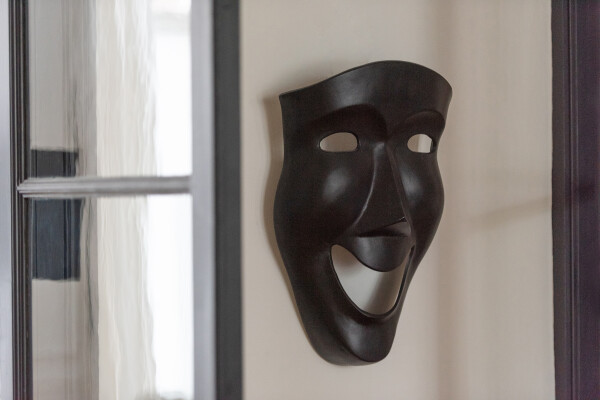 Ta dekoracja ścienna to propozycja dla osób, które lubią akcenty pełne charakteru. Czarne wykończenie tworzy efekt minimalistycznej rzeźby, a teatralny uśmiech dodaje całości intrygującej energii. Maska działa jak designerska instalacja – wyróżnia ścianę i podkreśla osobowość przestrzeni, nie dominując jej kolorem ani nadmiarem detali.