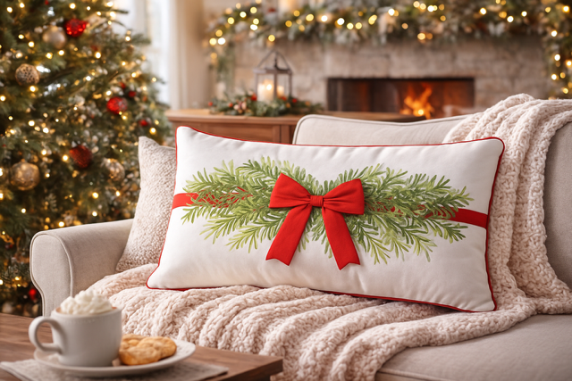 Co jeśli jeden drobny detal potrafi stworzyć w domu atmosferę, która przypomina o pierwszych zaświeconych lampkach na choince i wieczorach spędzonych pod kocem z kubkiem gorącej herbaty? Ta poduszka świąteczna — z soczyście zieloną gałązką i czerwoną kokardą jak z najpiękniej zapakowanego prezentu — wnosi do wnętrza miękkość, radość i nutę odświętnego uroku.