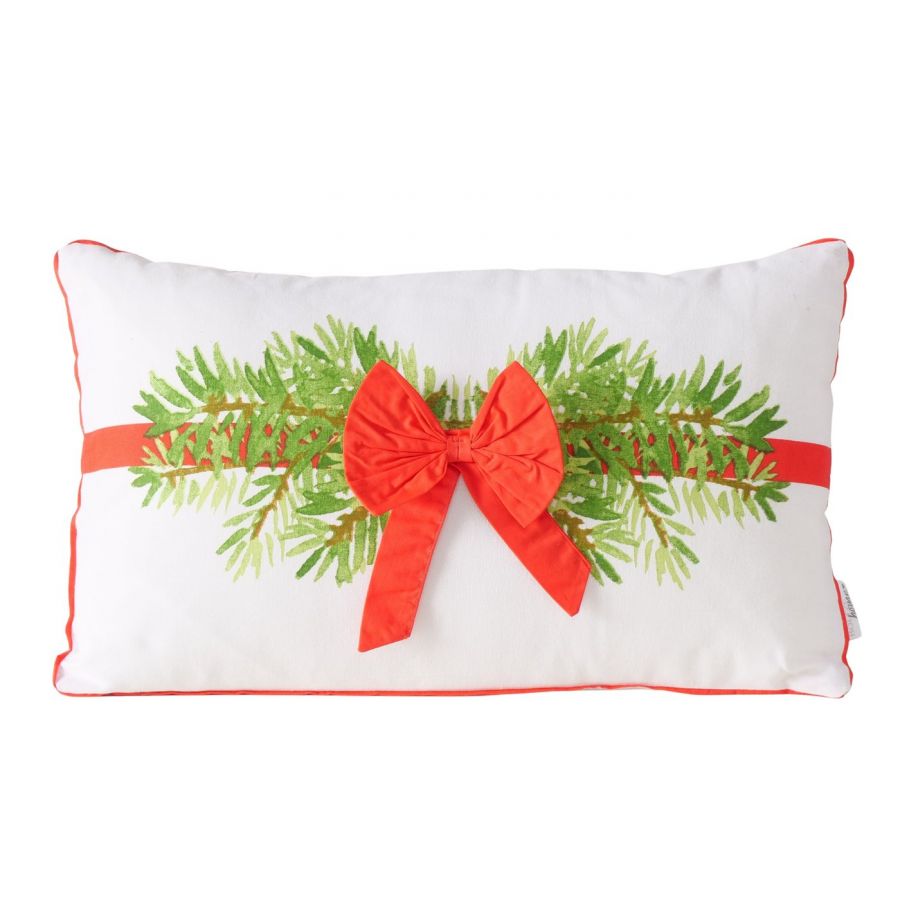 Białe tło podkreśla każdy detal zdobienia, a intensywna czerwień lamówki dodaje całości elegancji i harmonii. To dekoracja, która w grudniowe wieczory tworzy ramę dla rodzinnych chwil — leżąc na sofie, w fotelu lub na łóżku, staje się małym, lecz wyrazistym elementem świątecznej oprawy.