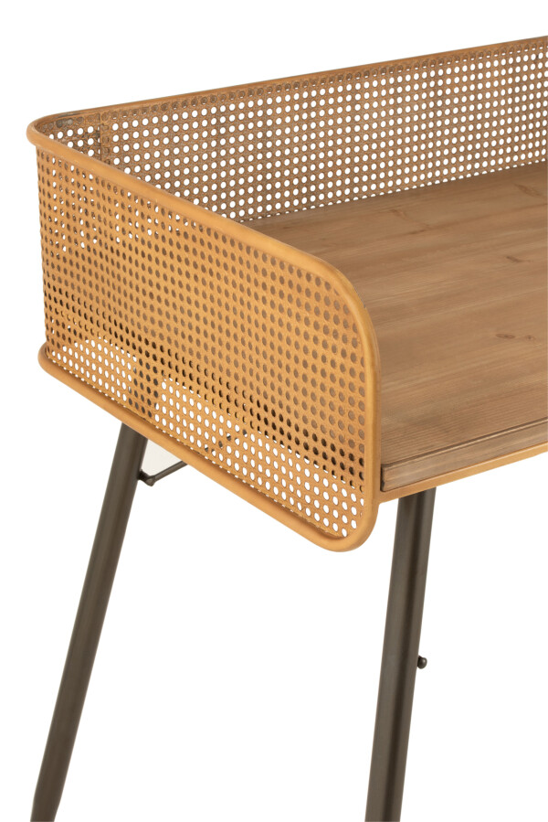 Połączenie perforowanych paneli z prostymi, stonowanymi nogami daje efekt zrównoważonej, współczesnej estetyki. Biurko prezentuje się świeżo i designersko, nie dominując wnętrza, a jedynie pięknie je akcentując. To idealny mebel do domowego biura, kreatywnej pracowni, a nawet do ustawienia w salonie jako elegancki kącik do pracy — zawsze wygląda stylowo, zawsze dodaje wnętrzu charakteru.