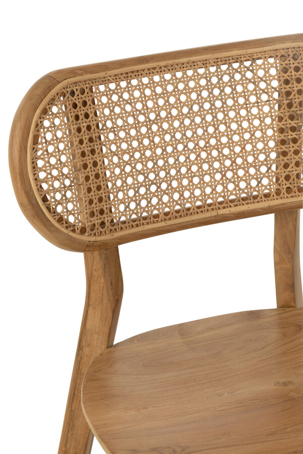 Owalne oparcie z rattanu nadaje meblowi wyjątkowy rys dekoracyjny, tworząc delikatny detal przyciągający uwagę swoją lekkością. Teakowe drewno prezentuje pełnię swojej struktury — widoczne słoje i nieregularności podkreślają jego autentyczność. Krzesło pozostaje wizualnie lekkie, a zarazem stabilne, idealne do wnętrz, w których liczą się naturalne faktury i spokojna paleta kolorystyczna.