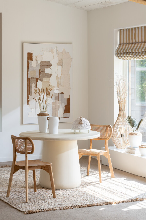 Krzesło Nora Teak powstało z myślą o wnętrzach, które celebrują spokój, światło i organiczne formy. Oparcie z delikatnej plecionki tworzy subtelną, lekką linię, a teakowe siedzisko dodaje całości miękkiego, naturalnego charakteru. To model, który od razu buduje poczucie harmonii i estetycznego wyciszenia w przestrzeni.