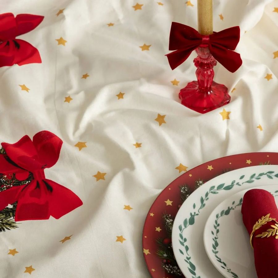 Delikatna gra czerwieni, złota i zieleni splata się w kompozycję o wyrafinowanej lekkości. Kokardy, symbol współczesnych trendów świątecznych, tworzą na tkaninie dekorację, która jest pełna klasy, a jednocześnie emanuje ciepłem i urokiem tradycji. Obrus prezentuje się szlachetnie zarówno w świetle dziennym, jak i przy blasku świec.