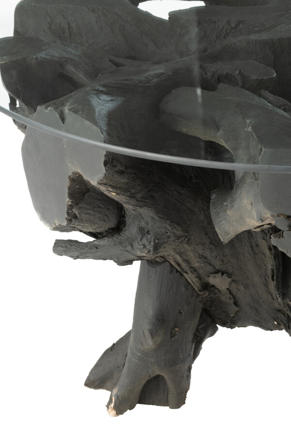 Czarne wykończenie podkreśla dramatyzm i głębię struktury drewna, a szklany blat dodaje jej lekkości. Połączenie tych materiałów sprawia, że ława staje się głównym elementem aranżacji – eleganckim, artystycznym i funkcjonalnym jednocześnie. Idealnie wpisuje się we wnętrza, które cenią kontrast, teksturę i organiczne formy.